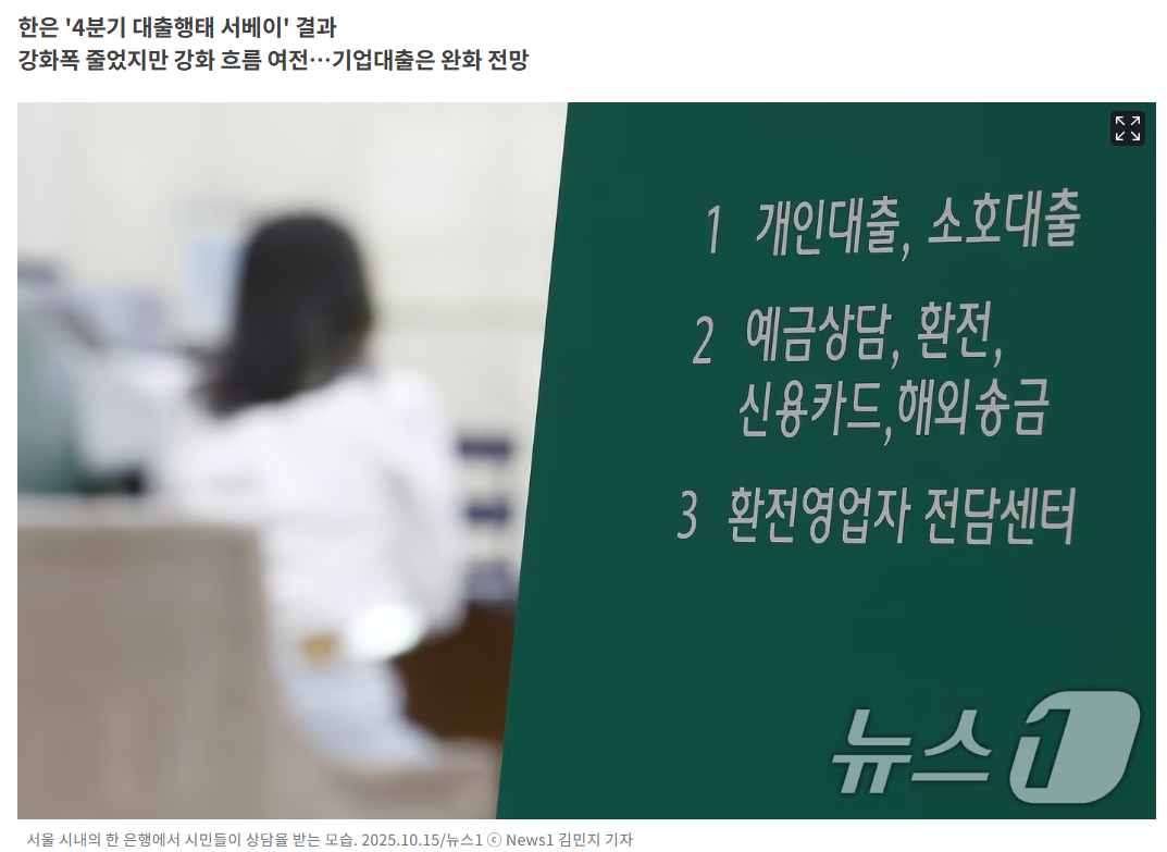 새 정부의 가계부채 관리 강화 영향으로 2025년 4분기 국내은행의 가계주택 대출 문턱이 한층 높아질 전망이다. 한국은행이 발표한 '금융기관 대출행태 서베이' 결과가 이를 뒷받침한다.