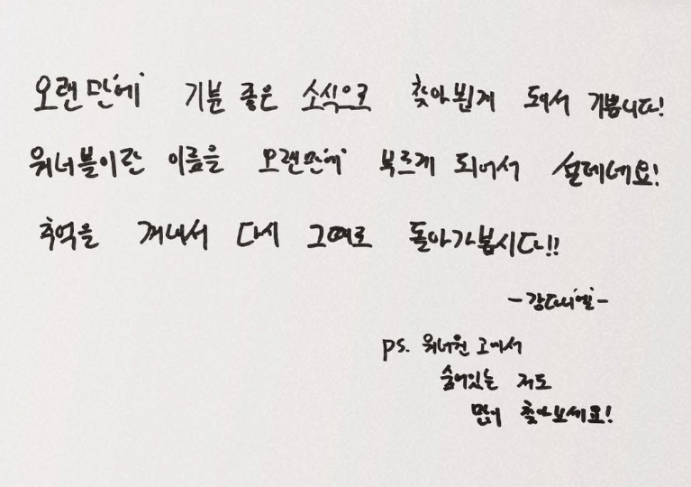 강다니엘은 팬들에게 “오랜만에 기분 좋은 소식으로 인사드리게 돼 기쁘다”며 “‘워너원 고’에 숨어있는 저도 많이 찾아달라”고 전했다.