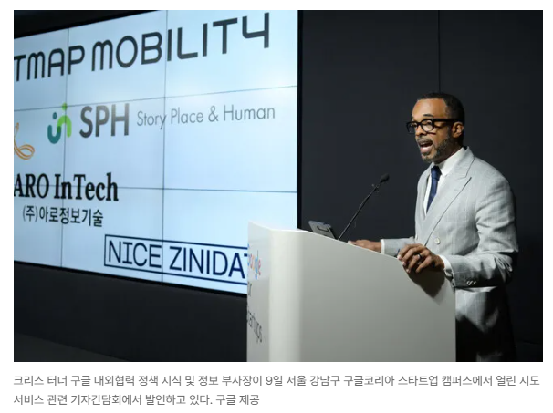 크리스 터너 구글 대외협력 정책 지식·정보 부문 부사장은 9일 서울 강남구 구글코리아 스타트업 캠퍼스에서 기자간담회를 열어 회사의 고정밀 지도 데이터 국외 반출 요청을 둘러싼 우려를 해소하기 위해 한국 정부와 지속적으로 협력하는 한편, 정부의 안보 관련 요구 사항을 수용하겠다고 설명했다. 이날 간담회는 주무 부처인 국토교통부와 사전 협의 없이 열렸다고 정부 쪽은 설명했다.
