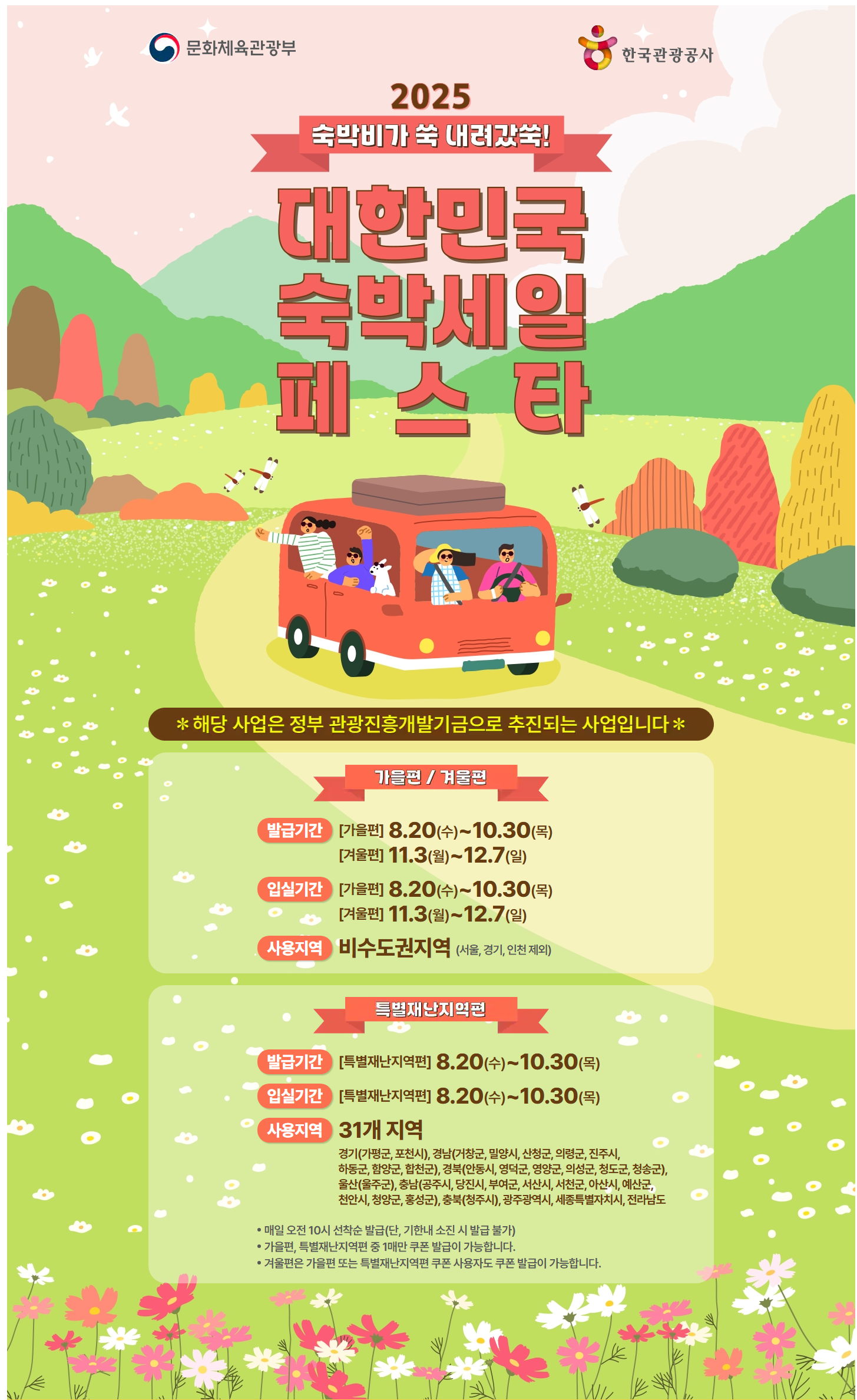 2025 대한민국 숙박세일 페스타는 문화체육관광부와 한국관광공사가 주관하는 전국 단위 숙박 할인 행사입니다. 가을과 겨울 성수기를 맞아 비수도권 지역의 숙박비를 할인하여 여행 활성화를 도모합니다.