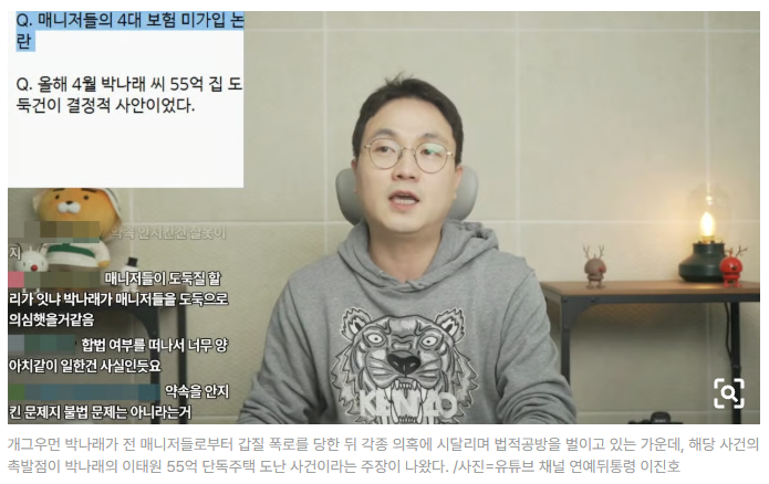 지난 15일 유튜브 채널 ‘연예뒤통령 이진호’는 「충격 단독! ‘가족 같은 매니저라더니’… 박나래 55억 집 도둑 사건 진실」이라는 제목의 영상을 공개했다.