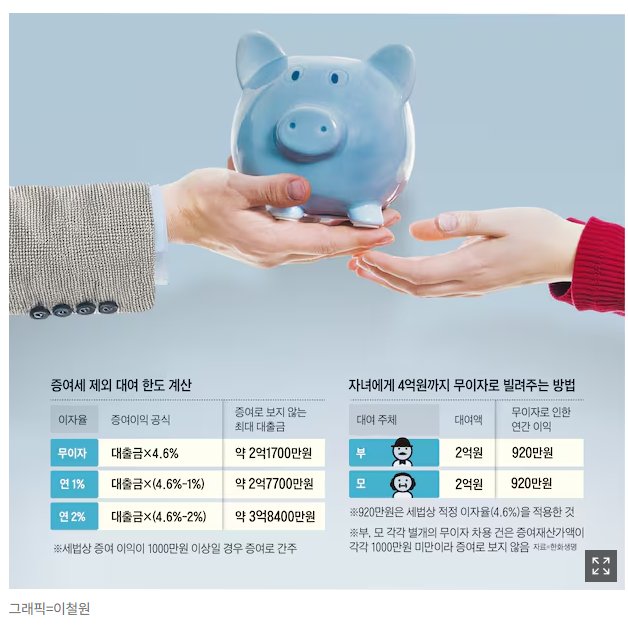 부부가 각각 자녀에게 돈을 빌려주는 경우라면 이야기가 달라진다. 각각의 거래가 분리되어 판단되기 때문에, 부모 두 사람이 각각 2억 원씩, 총 4억 원을 무이자로 빌려주는 구조도 가능하다.