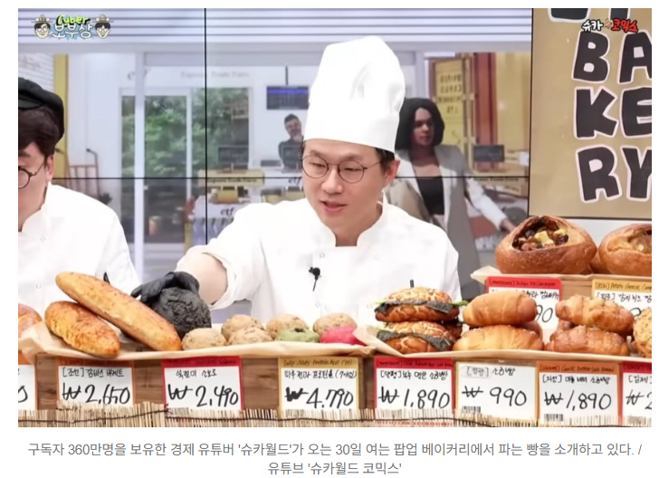 구독자 360만명을 보유한 경제 유튜버 슈카월드가 한국의 빵값 상승에 대응하기 위해 베이글과 소금빵 등을 최저 990원에 판매하는 팝업스토어를 열자 온라인에서 갑론을박이 벌어졌습니다. 빵집을 운영하는 자영업자들은 “원가가 1000원인데 졸지에 비싼 가격에 빵을 파는 사람이 됐다”며 반발했고, 소비자는 “한국의 빵값이 유독 비싼 건 맞지 않느냐”고 의견을 내놨습니다.