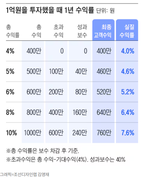 연 4.0%를 초과하는 수익이 발생할 경우, 초과 수익의 40%를 증권사가 성과보수로 가져간다.