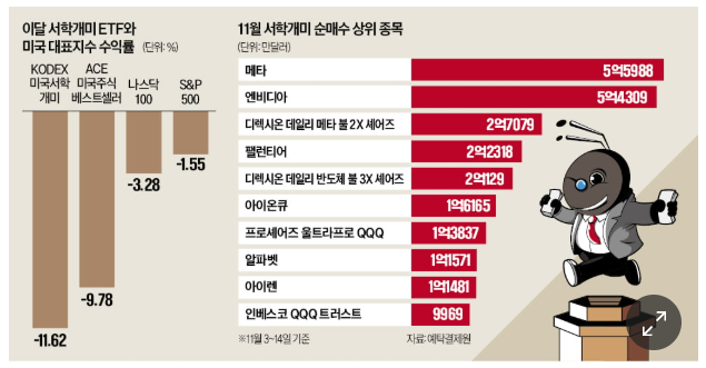 최근 인공지능(AI) 거품론이 제기되며 글로벌 AI 관련주가 일시적으로 조정을 받자, 국내 개인투자자(서학개미)가 오히려 미국 빅테크를 집중 매수한 것으로 나타났다. 특히 메타·엔비디아·팰런티어·알파벳 등 AI 대장주에 뭉칫돈이 대거 유입됐고, AI 및 반도체를 2~3배로 추종하는 레버리지 ETF에도 자금이 몰려 '풀베팅' 양상을 보이고 있다.