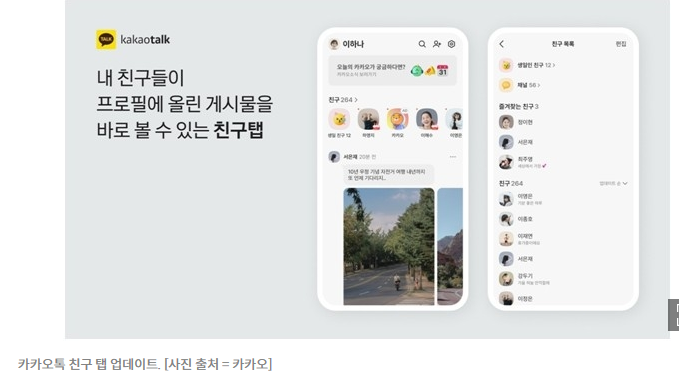 카카오는 최근 이프(if) 카카오 행사에서 친구탭을 피드형 사용자환경(UI)으로 개편했다고 밝혔습니다. 이제 친구 목록 대신 친구들의 프로필 업데이트 내역이 타임라인처럼 표시됩니다.