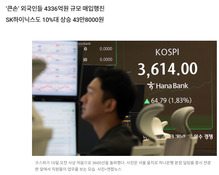 사상 첫 코스피 3600선 돌파의 주역은 단연 외국인 투자자였습니다. 외국인은 이날 오전에만 4336억 원 상당의 주식을 순매수하며 지수를 끌어올렸습니다. 반면 기관은 4466억 원어치를 순매도했고, 개인도 13억 원 규모를 매도했습니다.