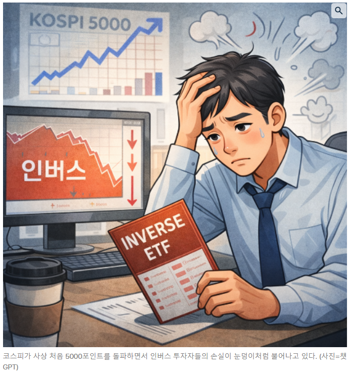 코스피가 사상 처음으로 5000포인트를 돌파하면서 지수 하락에 베팅한 인버스 투자자들의 손실이 빠르게 커지고 있다.