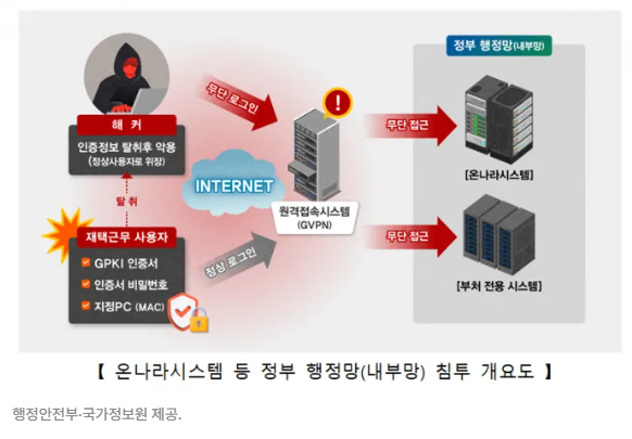 행안부는 17일 세종정부청사에서 열린 ‘정부업무관리시스템(온나라) 해킹 대응 브리핑’에서 “올해 7월 중순, 국가정보원을 통해 외부 인터넷 PC가 정부원격근무시스템(G-VPN)을 경유해 업무망인 온나라시스템에 접근한 정황을 확인했다”고 밝혔습니다.