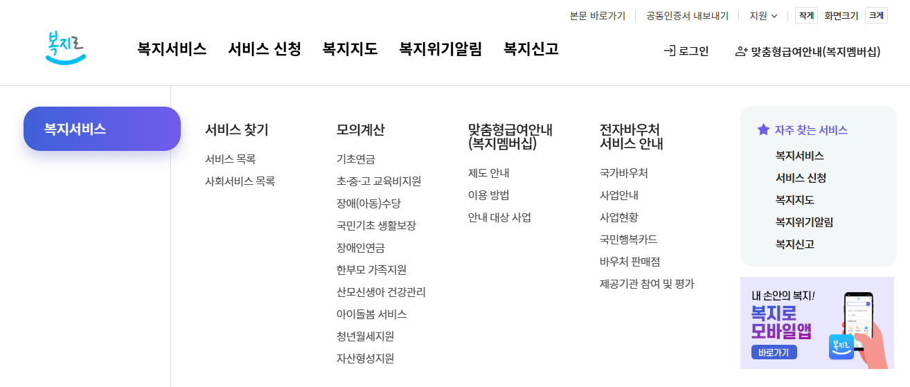 - 복지로 홈페이지 접속 → 복지로 바로가기